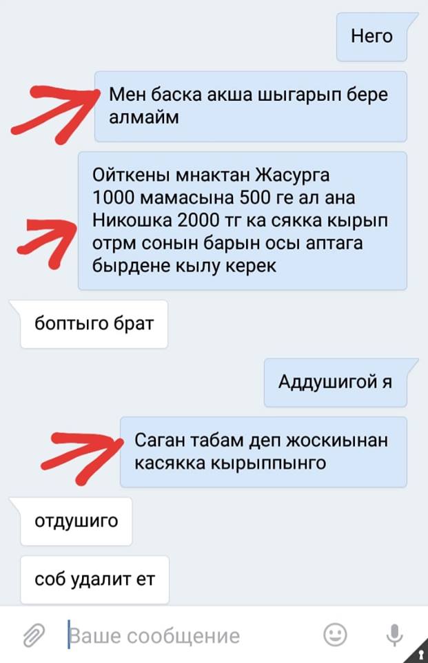 Сол 4 баланың ішіндегі М есімді баланың ВК әлеуметтік желісінде қайтыс болған Ерсұлтанға және тағы да басқаларға ақша сұрап жазған, смс хабарламаларын және сол смс хабарламаларды өшіріп тастау туралы жазылған жазбалар анықталып тұр! Алайда ол ВК әлеуметтік желісінде АҚША СҰРАҒАНЫ ДӘЛЕЛДЕНІП ТҰРСА ДА, сол балалар жауапқа мүлдем тартылмай, өздерінен төменгі, кіші сыныпта оқитын, мектептің үлгілі баласы әрі президенті НҰРБЕК есімді бала 3 ЖЫЛҒА БАС БОСТАНДЫҒЫНАН АЙЫРЫЛЫП ҚАМАЛЫП КЕТЕДІ! НЕГЕ?