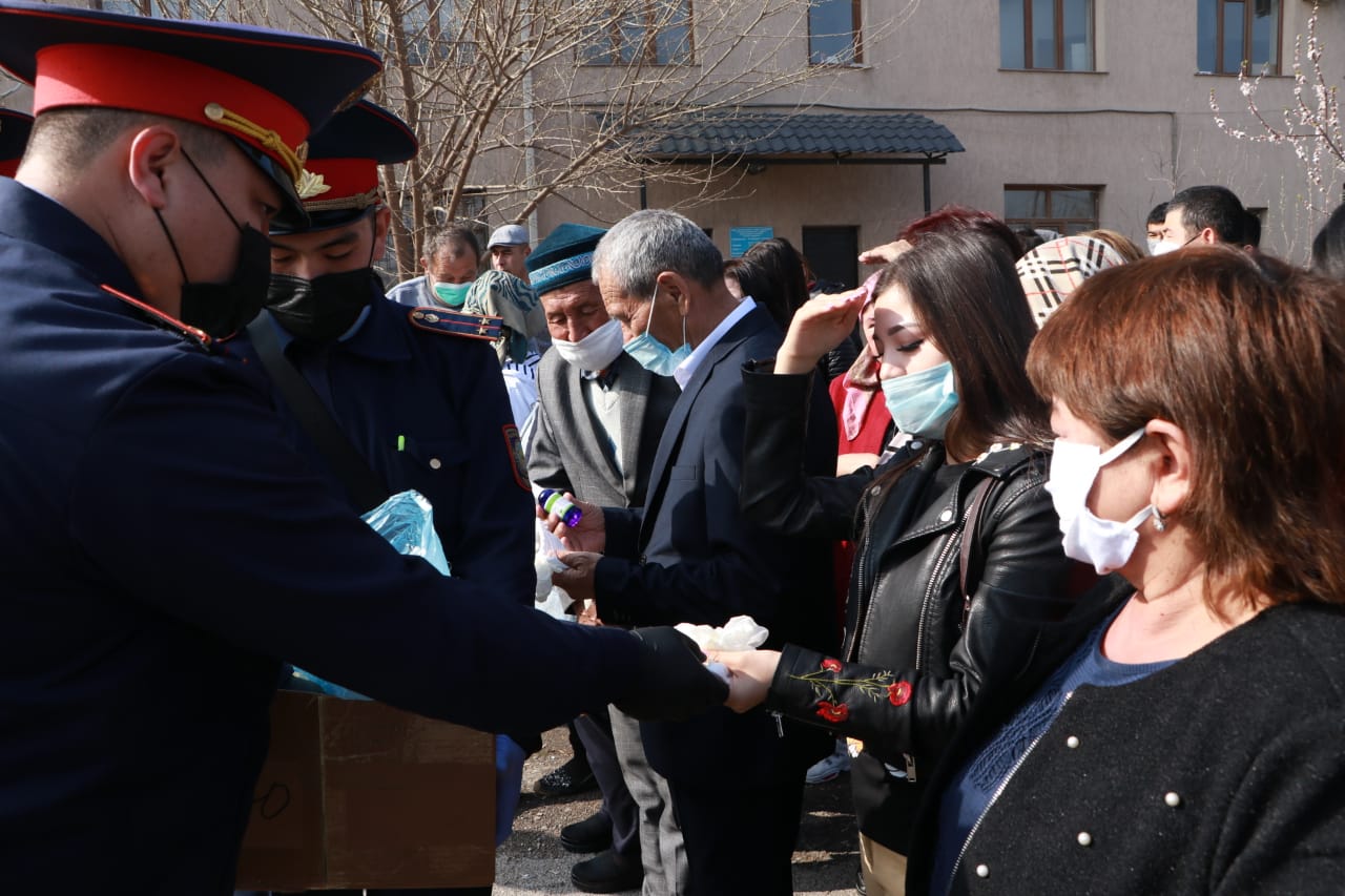 Шымкент қаласының Полиция департаменті бастығының бірінші орынбасары полиция полковнигі Мурат Алтаев қоғамдық қауіпсіздікті қамтамасыз етуге кіріскелі тұрған Қаратау және Абай аудандарының Полиция басқармаларының қызметкерлерімен кездесіп, сап түзеген полиция қызметкерлерінің қызметке әзірлігін тексеріп, елімізде төтенше жағдай туралы ақпарат беріп, міндеттерді баяндап, тиісті тапсырмалар берді. Төтенше жағдай кезіңде еріктілер полиция қызметкерлерімен бірге қала тұрғындарына індеттің қауіптілігін түсіндіріп, үйлерінен мүмкіндігінше шықпауға, қозғалысты шектеуге, халық көп шоғырланатын жерлерге бармауға, барлық қауіпсіздік шараларын сақтауды шақырды.