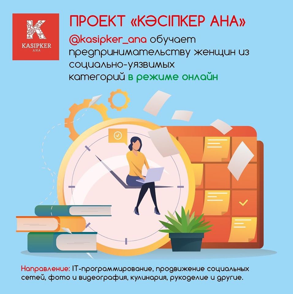 «Обучившись несколько месяцев на курсах, женщины смогут приобрести профессию повара, кондитера, копирайтера, парикмахера, фотографа, SMM-cпециалиста. Чтобы выявить наиболее сильные стороны наших участниц, мы привлекли экспертов, которые способны определить их потенциал. Сейчас более 250 женщин проходят онлайн курсы. Мы выходим на Ютуб, проводим прямые эфиры в Инстаграм, кроме того, есть записи, которые можно посмотреть. К нам обращаются не только мамы, но и действующие предприниматели, у которых есть бизнес, кто хочет начать свое дело онлайн. Это сейчас очень актуально. Карантин показал, что очень многие профессии могут перейти на онлайн-формат, и я думаю, что в дальнейшем мы будем расширять эту линейку», — сообщила автор и организатор проекта «Кәсіпкер ана» Айнур Амирхан.