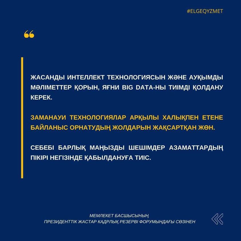 «Жасанды интеллект технологиясын және ауқымды мәліметтер қорын, яғни Big Data-ны тиімді қолдану керек. Заманауи технологиялар арқылы халықпен етене байланыс орнатудың жолдарын жақсартқан жөн. Себебі барлық маңызды шешімдер азаматтардың пікірі негізінде қабылдануға тиіс».
