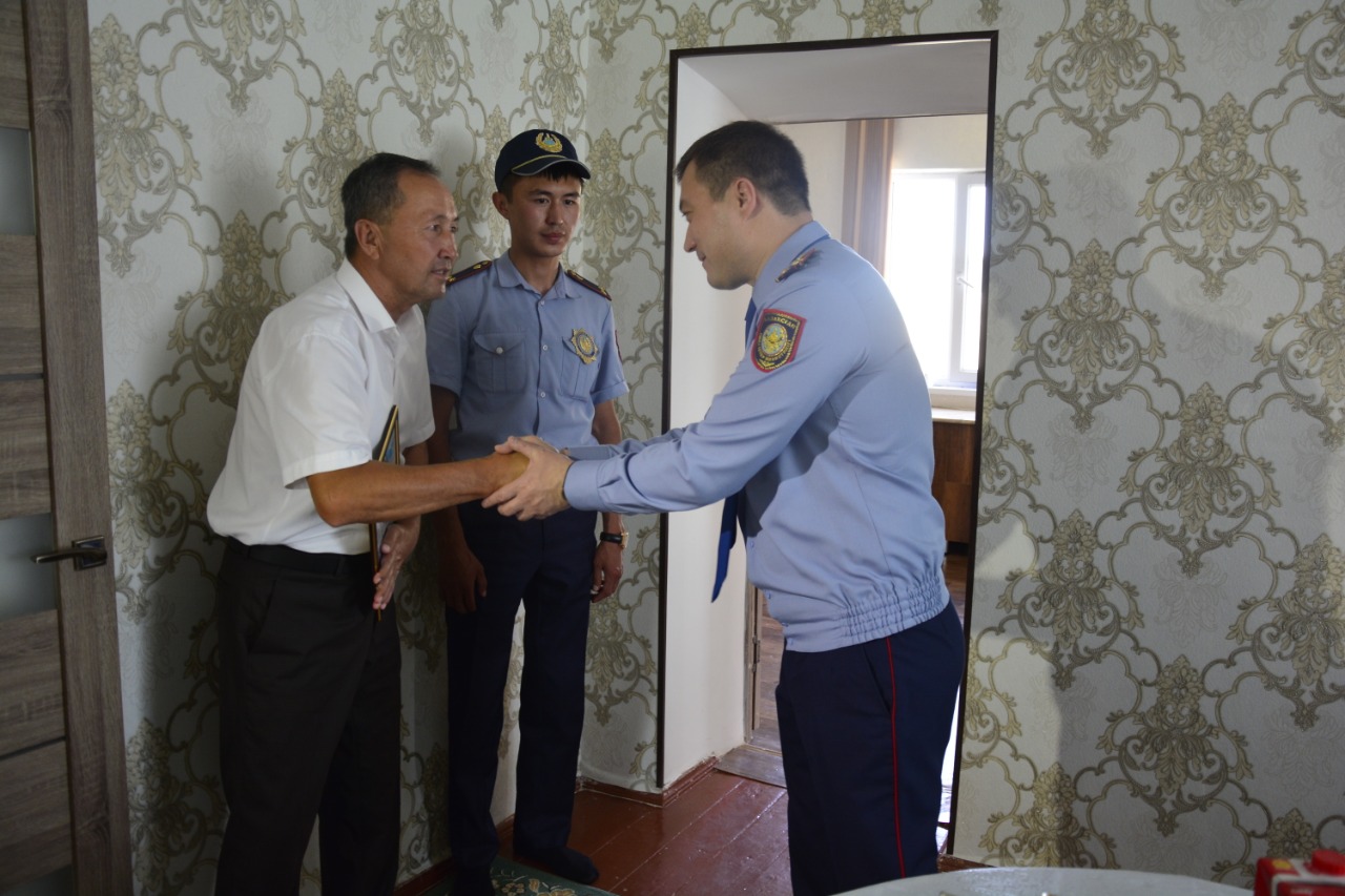В преддверии Дня казахстанской полиции, отмечаемого 23 июня, начальник Департамента полиции Жамбылской области Арман Оразалиев посетил одного из заслуженных ветеранов ОВД, обладателя высокой правительственной награды – ордена «Айбын» II степени – Нургали Улькеевича Омарова, чтобы отдать дань уважения подполковнику полиции за проявленное в свое время мужество и высокий профессионализм при обеспечении законности и охраны общественного порядка.
